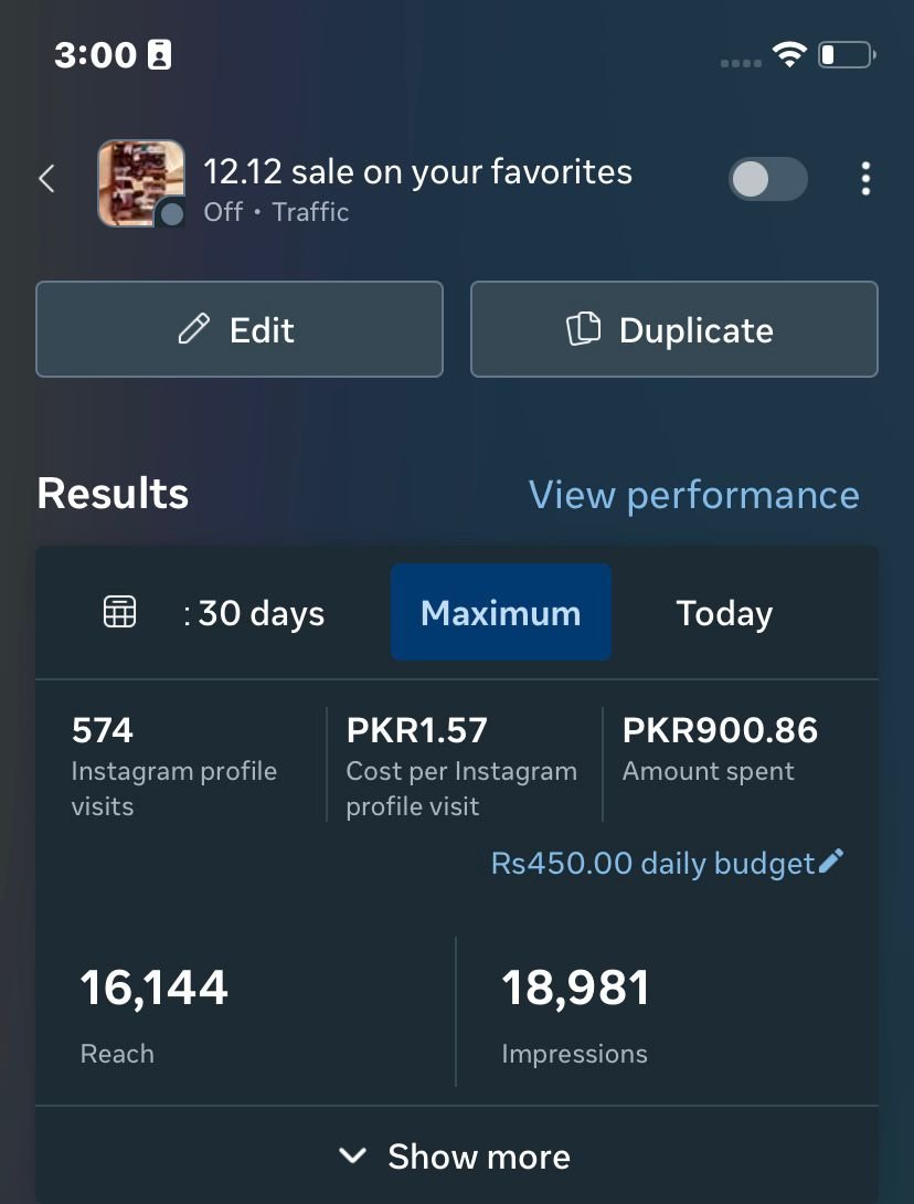 | Direct Revenue | PKR 34000 | From a lean daily budget (PKR 450–650), we converted interest into 46 Add-to-Carts and over PKR 34k in net sales, achieving a 3X ROAS (Return on Ad Spend). |