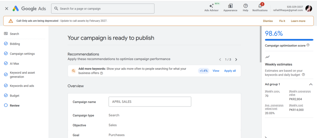 Having saturated the discovery phase on Meta with 34,000+ views, I drafted an ‘APRIL SALES’ Google Search Campaign to capture high-intent buyers already searching for aesthetic stationery.